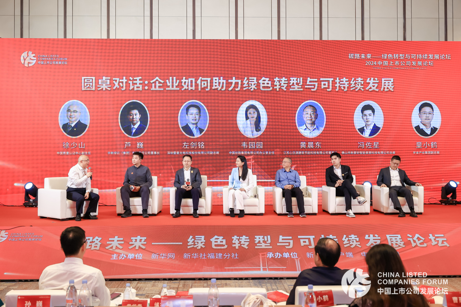 圆桌对话环节由中国质量认证中心副主任徐少山主持,邀请了华新绿云(集团)有限责任公司董事长芦巍、深圳雷曼光电科技股份有限公司副总裁左剑铭、中国丝路集团有限公司办公室主任韦园园、江苏心日源建筑节能科技有限公司董事长黄晨东、佛山市新豪轩智能家居科技有限公司总裁冯佐星、岁金产业集团副总裁童小鹤等嘉宾,就“企业如何助力绿色转型与可持续发展”话题进行了深入探讨与展望。