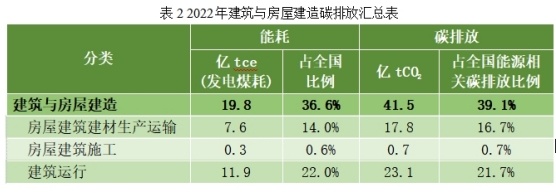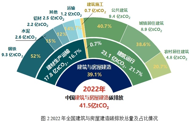 2022年全国建筑与房屋建造碳排放总量41.5亿tCO2,占全国能源相关碳排放39.1%。