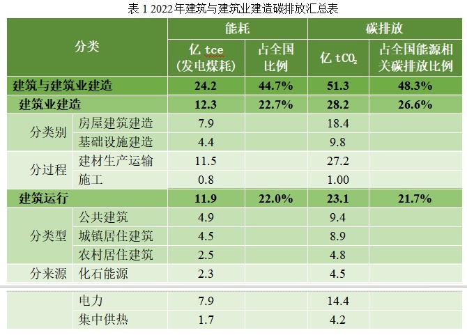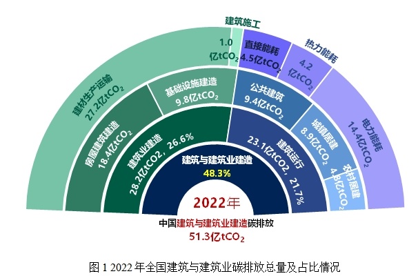 2022年全国建筑与建筑业建造碳排放总量51.3亿tCO2,占全国能源相关碳排放48.3%。