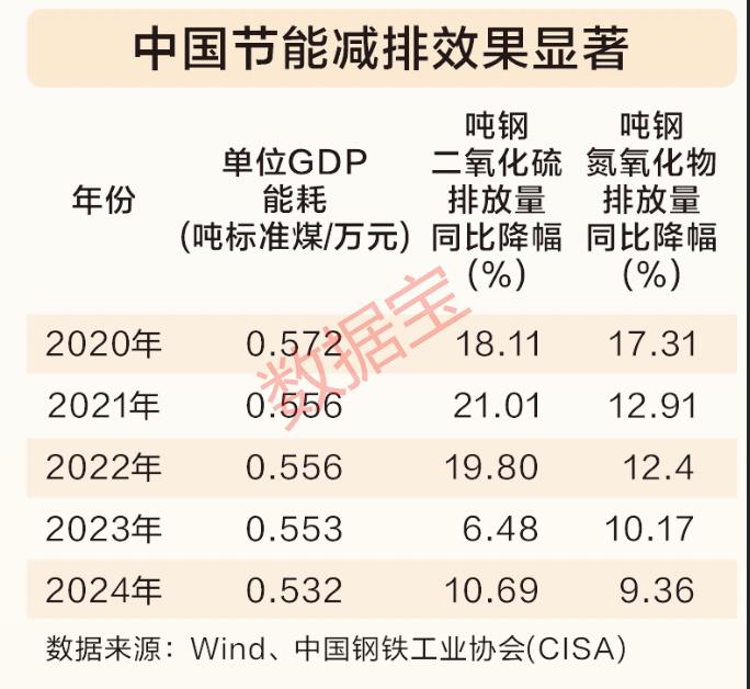 以钢铁行业为例,作为碳排放大户,其节能减排成果斐然。2020年至2024年,吨钢新水消耗下降4.9%,吨钢二氧化硫排放下降47.09%,吨钢氮氧化物排放下降37.88%。行业龙头宝钢股份2023年总用水量较2020年下降11.49%,单位营收耗水量较2020年下降27%。