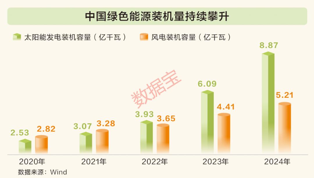截至2024年底,我国可再生能源装机规模达到18.89亿千瓦,约占我国总装机的56%,较“十三五”末实现翻倍,标志着可再生能源已占据我国电力装机的“半壁江山”,成为能源供应的重要支柱。其中,风光产业表现亮眼,2024年我国风电、太阳能发电量占总发电量比重分别较2020年提高3.89个和4.96个百分点,在全球新能源供应链占据核心地位。