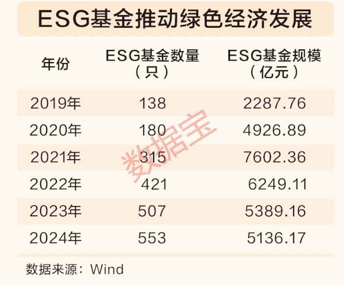 截至2024年末,国内ESG基金总数攀升至553只,规模达5136.17亿元,分别较2019年增长300.72%和124.51%。