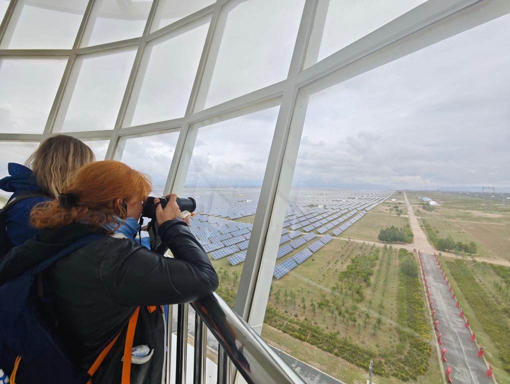 7月1日,外媒记者在位于塔拉滩的光伏园区拍摄。新华社记者陆君钰摄