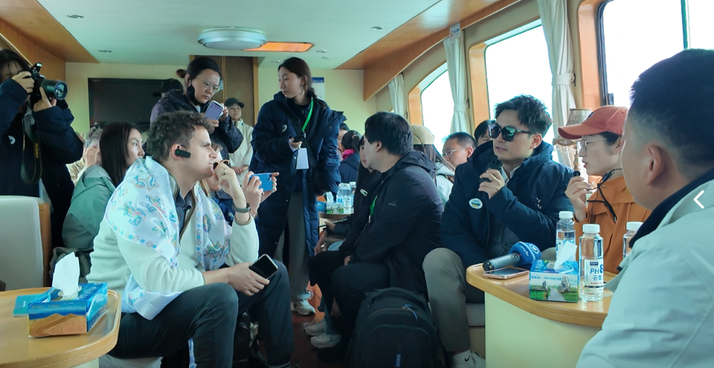 7月1日,记者在青海湖游船上提问。新华社记者陆君钰摄