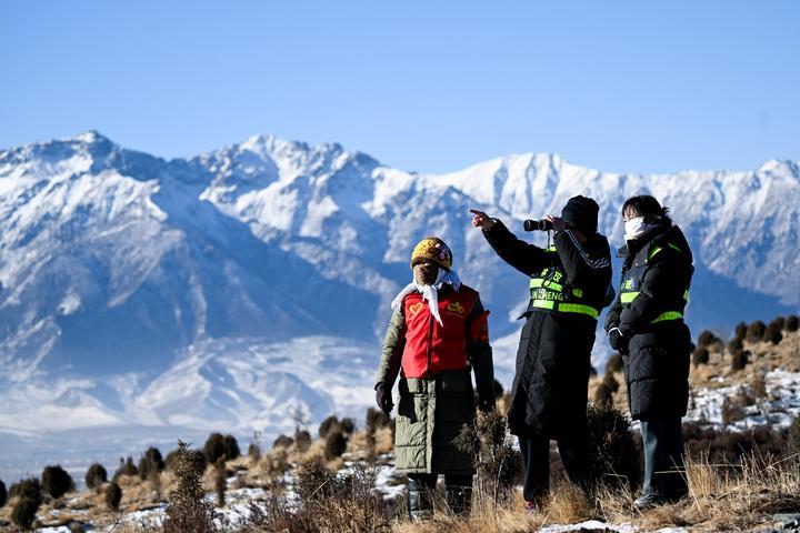 2025年1月28日,青海门源县境内的祁连山国家公园老虎沟管护站的生态管护员在巡护祁连山。