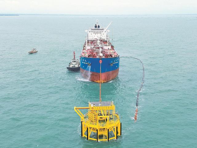8月18日10时24分许,装载约2.5万吨原油的“天鹰座”轮缓缓离开广东省雷州市乌石终端原油外输单点水域,标志着乌石23-5油田首次原油外输作业圆满完成,“湛江产”原油外输实现“零”的突破,湛江海事部门加强现场监护保障油轮提油作业安全。