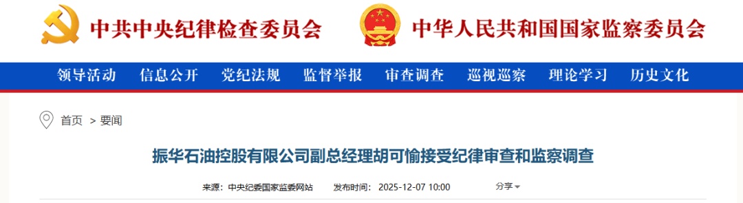 中央纪委国家监委网站12月7日消息,据中央纪委国家监委驻中国兵器工业集团有限公司纪检监察组消息:振华石油控股有限公司副总经理胡可愉涉嫌严重违纪违法,目前正接受中央纪委国家监委驻中国兵器工业集团有限公司纪检监察组纪律审查和监察调查。