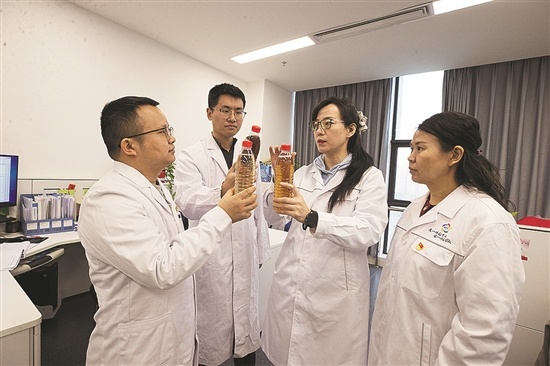 塔里木油田油气工艺研究院基础研究部井完整性二级工程师宋文文(右二)在给团队介绍不同类型缓蚀剂的性能、适用性及应用注意事项。陈士兵摄