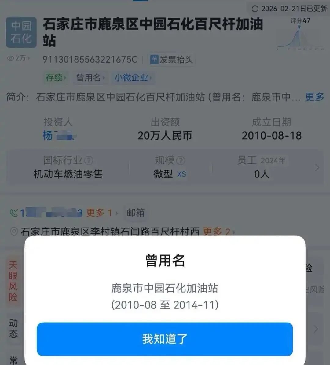据极目新闻,记者查询天眼查发现,该加油站为石家庄市鹿泉区中园石化百尺杆加油站,曾用名为鹿泉市中园石化加油站。