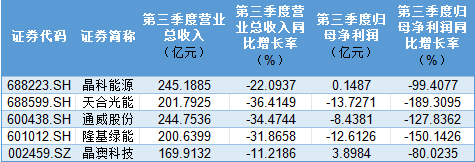 以隆基绿能为例,该公司前三季度合计计提资产减值损失65.58亿元,第三季度计提资产减值损失7.74亿元,受资产减值损失增加,以及产品价格下降、联营企业投资收益减少影响,报告期内盈利大幅下滑。