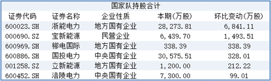 就具体企业看,地方国资代表浙江浙能电力股份有限公司(以下简称“浙能电力”)一季度获“国家队”增持数量最多,达6841.11万股;民营企业广东宝丽华新能源股份有限公司(以下简称“宝新能源”)增持股数位列其后,为1493.51万股。