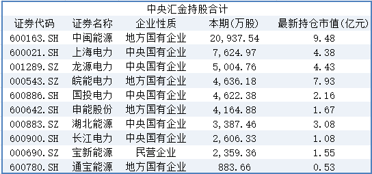 一季度,中央汇金合计持有电力板块10只个股,持股总量5.62亿股,最新持仓市值36.31亿元。个股中,中闽能源股份有限公司(以下简称“中闽能源”)获持有2.09亿股,对应市值9.48亿元,持股数量、持仓市值双双居首。