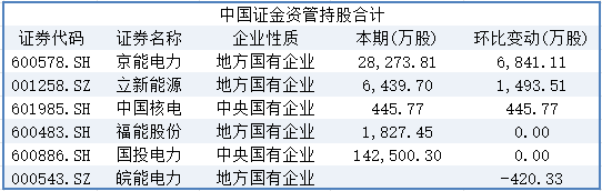 报告期内,中国证金资管增持3只个股,减持1只。其中,北京京能电力股份有限公司(以下简称“京能电力”)增持数量最多,为6841.11万股;国投电力控股股份有限公司(以下简称“国投电力”)持股总量最大,达14.25亿股。