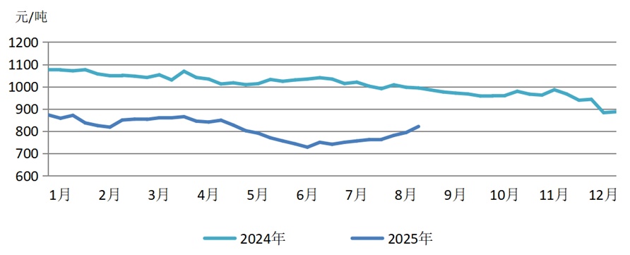 7月,高温多雨等极端天气对户外施工有一定影响,但政策端刺激效应释放,市场情绪趋于积极,钢铁市场需求有所回升,新订单指数反弹至扩张区间,创阶段性新高。供给端随需求同步恢复,生产活动明显回暖,钢厂粗钢产量环比回升。钢材价格同步上行,行业信心有所增强,生产经营活动预期指数回升至扩张区间。当月钢铁PMI为50.5%,环比上升4.6个百分点,结束连续2个月环比下降态势,重回扩张区间。截至2025年7月末,中国钢材价格指数(CSPI)为95.87点,环比上升6.36点,升幅为7.11%;比上年末下降1.60点,降幅为1.64%;同比下降1.13点,降幅为1.16%。进入8月份,国内钢材市场逐步回归基本面,钢价在需求较弱、库存持续累积背景下小幅震荡运行。