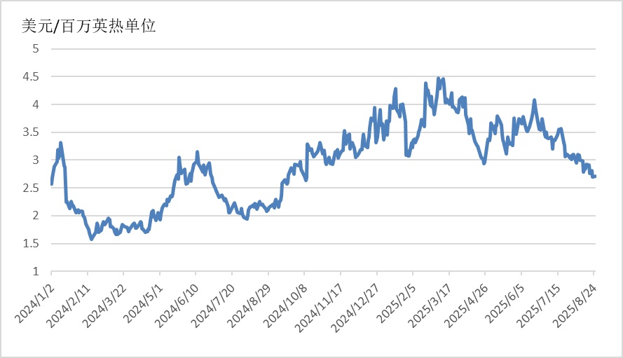 截至8月25日,美国Henry Hub天然气主力合约收于2.709美元/百万英热单位,月环比下降12.47%,相较于2024年同期的2.12美元/百万英热单位,上涨27.78%。