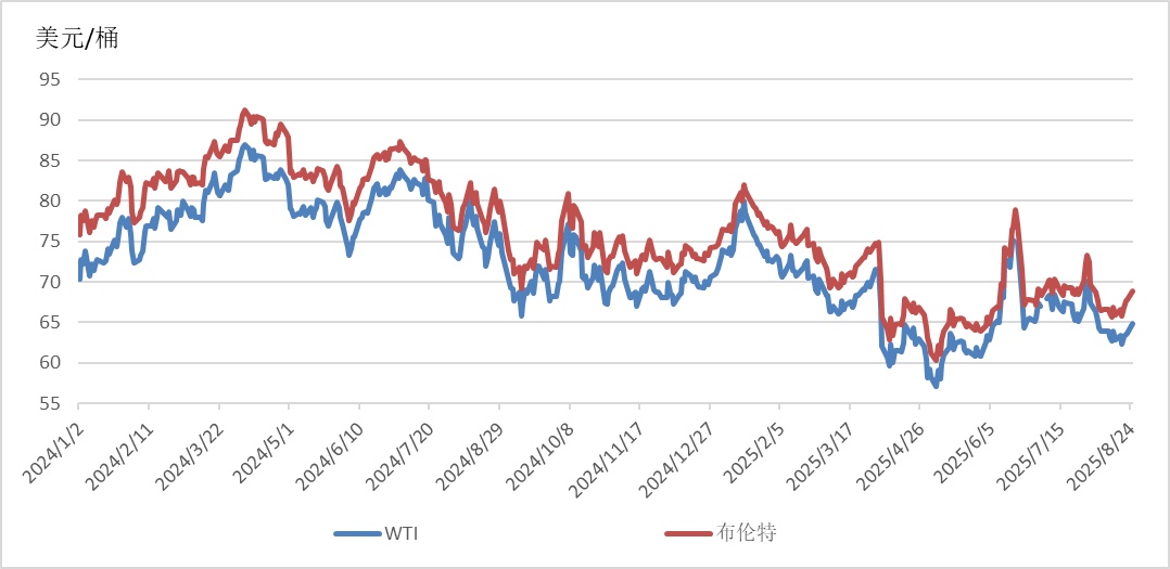 截至8月25日,WTI、布伦特原油期货价格分别收于64.8美元/桶、68.8美元/桶,月环比分别下降0.55%、上涨0.53%,相较于2024年同期的77.42美元/桶、81.43美元/桶,分别下降16.30%、15.51%。