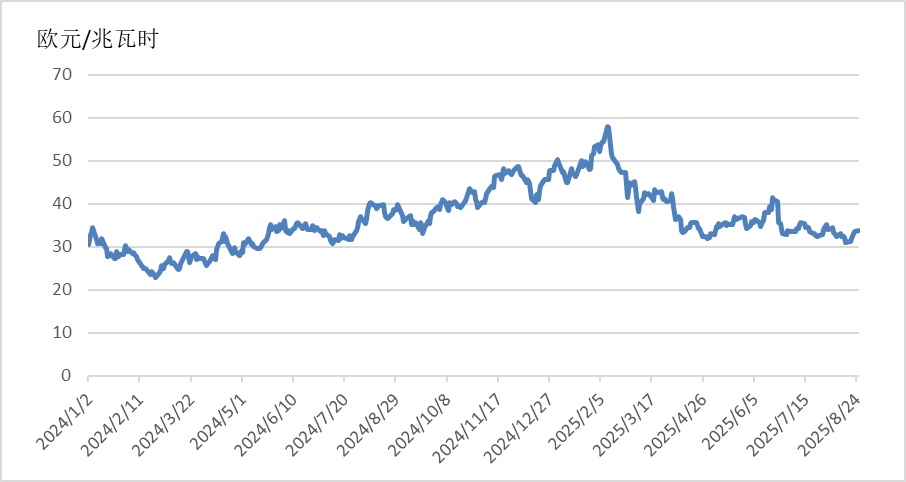 截至8月25日,TTF天然气期货主力合约收于33.774欧元/兆瓦时,月环比上涨3.92%,相较2024年同期的37.655欧元/兆瓦时,下降10.31%。