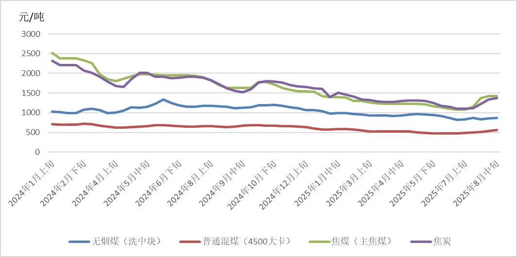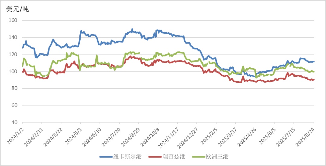 截至8月25日,澳大利亚纽卡斯尔港煤炭期货价格报收于111.3美元/吨,月环比上涨1.00%,相较2024年同期的145.7美元/吨,下降23.61%;南非理查兹港煤炭期货价格报收于90.2美元/吨,月环比下降4.85%,相较2024年同期的115.4美元/吨,下降21.84%;欧洲三港煤炭期货价格报收于99.5美元/吨,月环比下降4.70%,相较2024年同期的121.15美元/吨,下降17.87%。