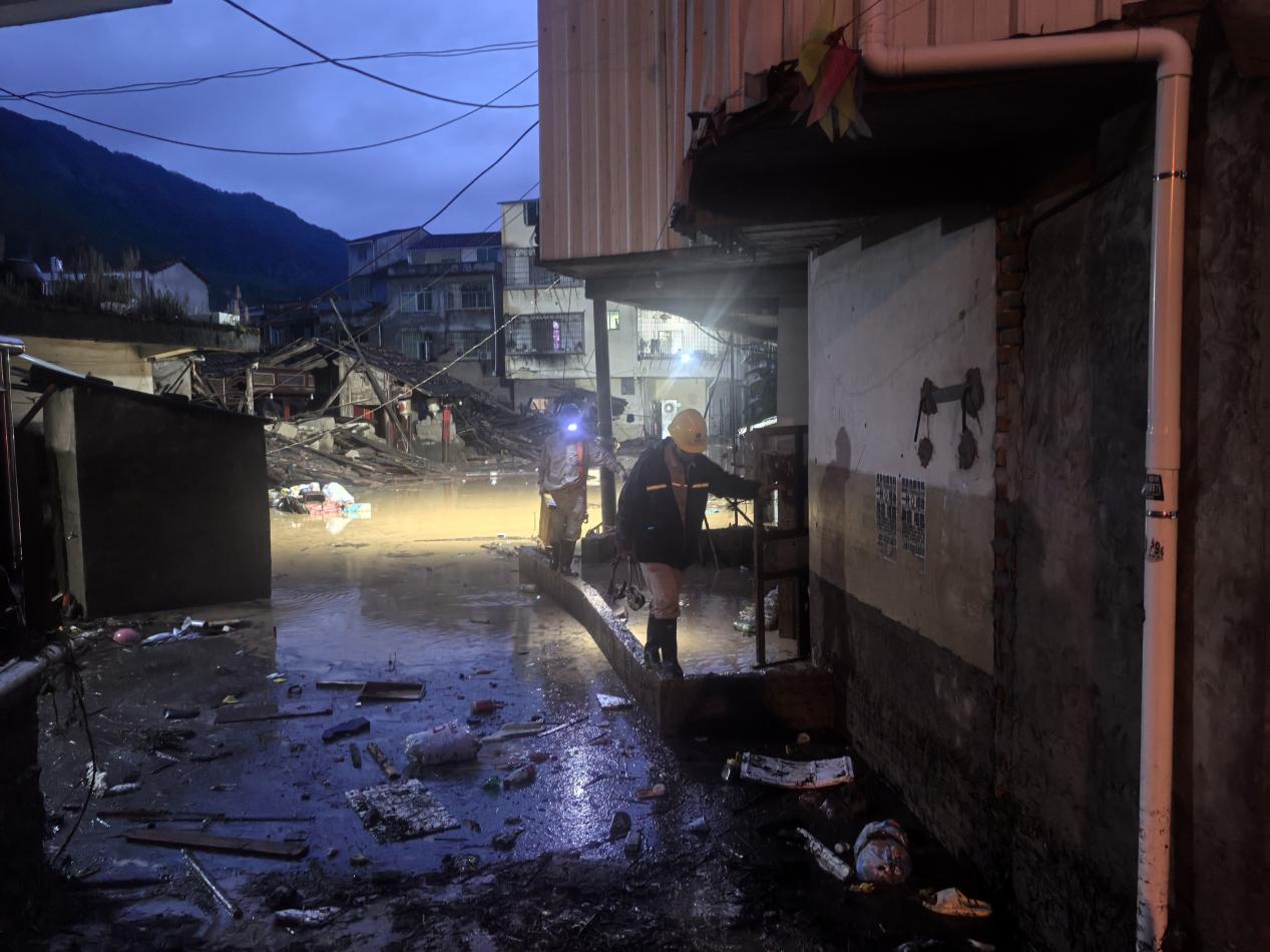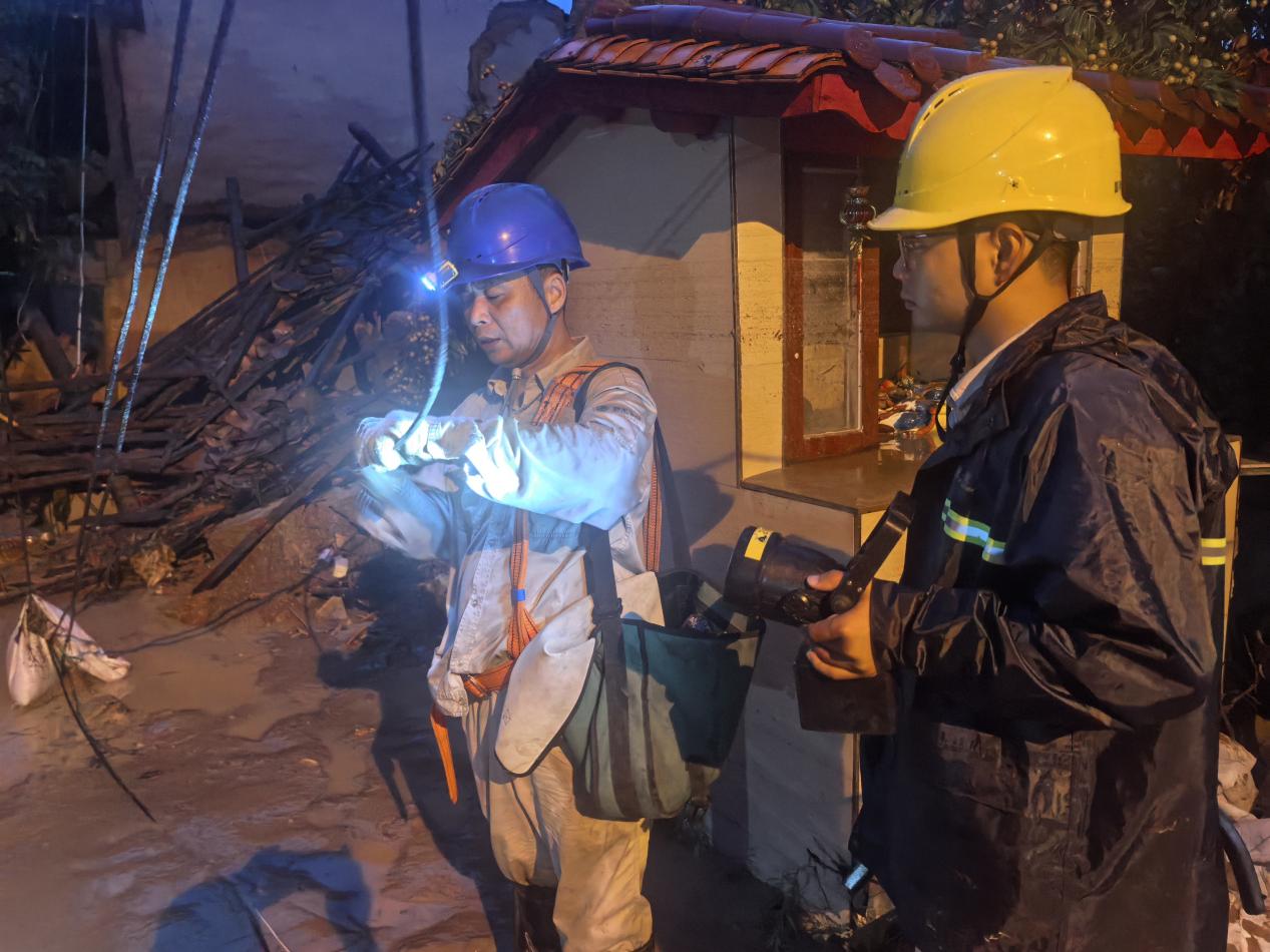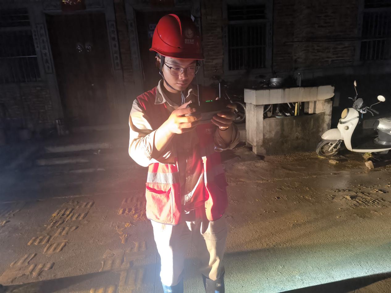 在榜头镇部分塌方路段,队员们踩着没过脚踝的泥浆,逐基查看电杆倾斜度,重点检查洪水冲刷后的电杆基础、导线绝缘层等关键部位。“昨天这里刚迁移了洪水中的电杆,基础还没完全稳固,必须重点监测沉降情况。”共产党员服务队队员陈勉一边记录数据,一边叮嘱身旁的年轻队员。