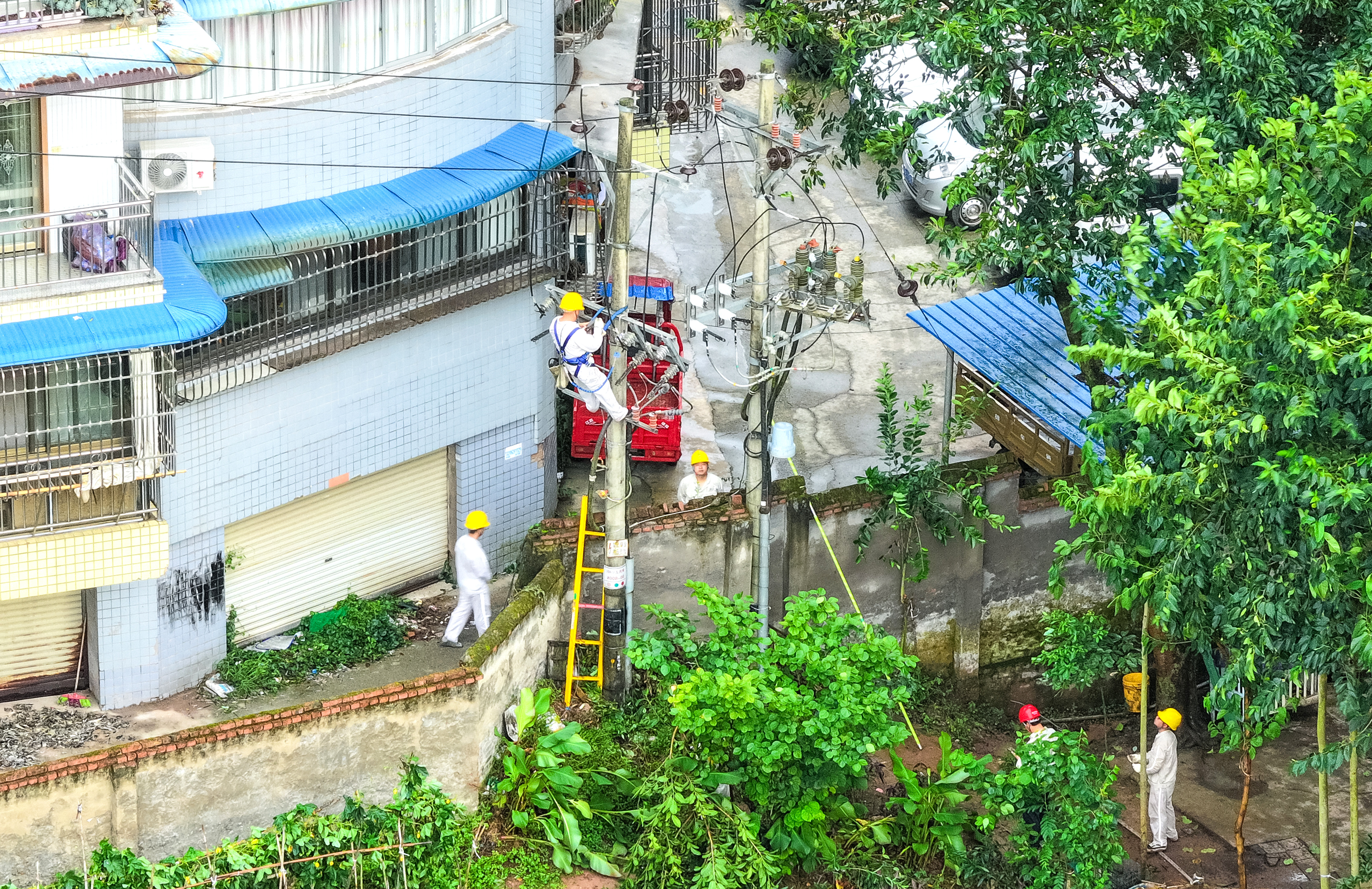 在垫江县明月大道南段,受本次强降雨影响,10千伏玉月线8号杆C相隔离开关引流线断线。抢修人员赶到现场后冒雨特巡,发现故障点后立即布置安全措施,有序展开抢修。16时40分,经过30分钟紧密配合,抢修人员顺利完成了这根引流线的连接,该线路恢复了正常供电。