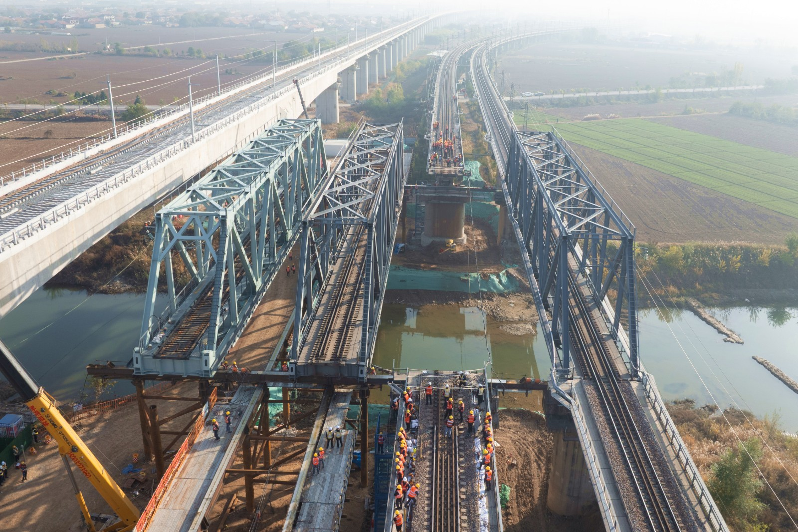 本次更换的243A#钢桁梁位于朔黄铁路南运河特大桥上行线,桥梁跨度64米,施工条件极为复杂,一侧紧邻持续运营的下行线路,另一侧距在建石港城际铁路仅30米,作业空间狭窄,交叉施工干扰大。在必须确保铁路正常运输的前提下,工程团队需在有限的天窗时间内,完成长达65.1米、重达420吨的新梁更换任务,施工难度很大,且国内尚无同类重载铁路施工经验可直接借鉴。