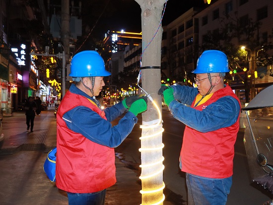 当晚夜幕降临,城区亮化设施被陆续点亮。队员们携带测电笔、钳形表、绝缘胶带等工具,沿着主次干道逐街逐段开展“拉网式”排查。重点对沿街悬挂的彩灯、灯笼、灯带等节日亮化设备进行全面“体检”,仔细检查线路敷设是否规范、接头是否牢固、绝缘层是否破损、有无私拉乱接现象,同时对广场、公园等人员密集场所的配电箱、开关、照明线路进行细致检测,精准排查漏电、过载、接触不良等安全隐患。