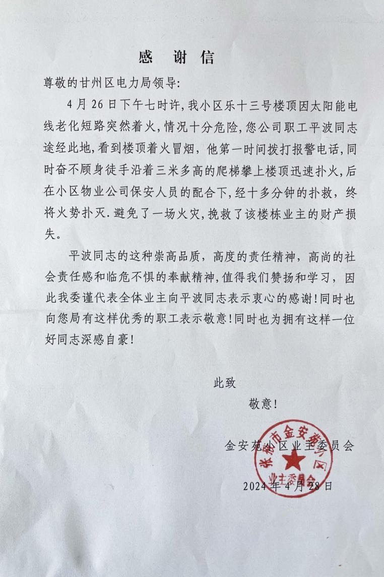 时间追溯到4月26日下午,金安苑小区乐十三号楼顶因太阳能电线老化短路突然着火,情况十分危急。该公司职工平波同志在回家的途中,看到楼顶着火冒出滚滚浓烟,面对这一紧急时刻,平波迅速反应,立即拨打报警电话告知事故发生位置,并大声呼喊周围的居民进行疏散,随后他徒手沿着旁边三米多高的爬梯攀上楼顶进行扑火,在小区物业公司保安人员的配合下,经过十几分钟的紧急扑救,将火完全扑灭,避免了一场火灾,挽救了该楼栋业主的财产损失。看到现场已经安全,平波悄然离开。