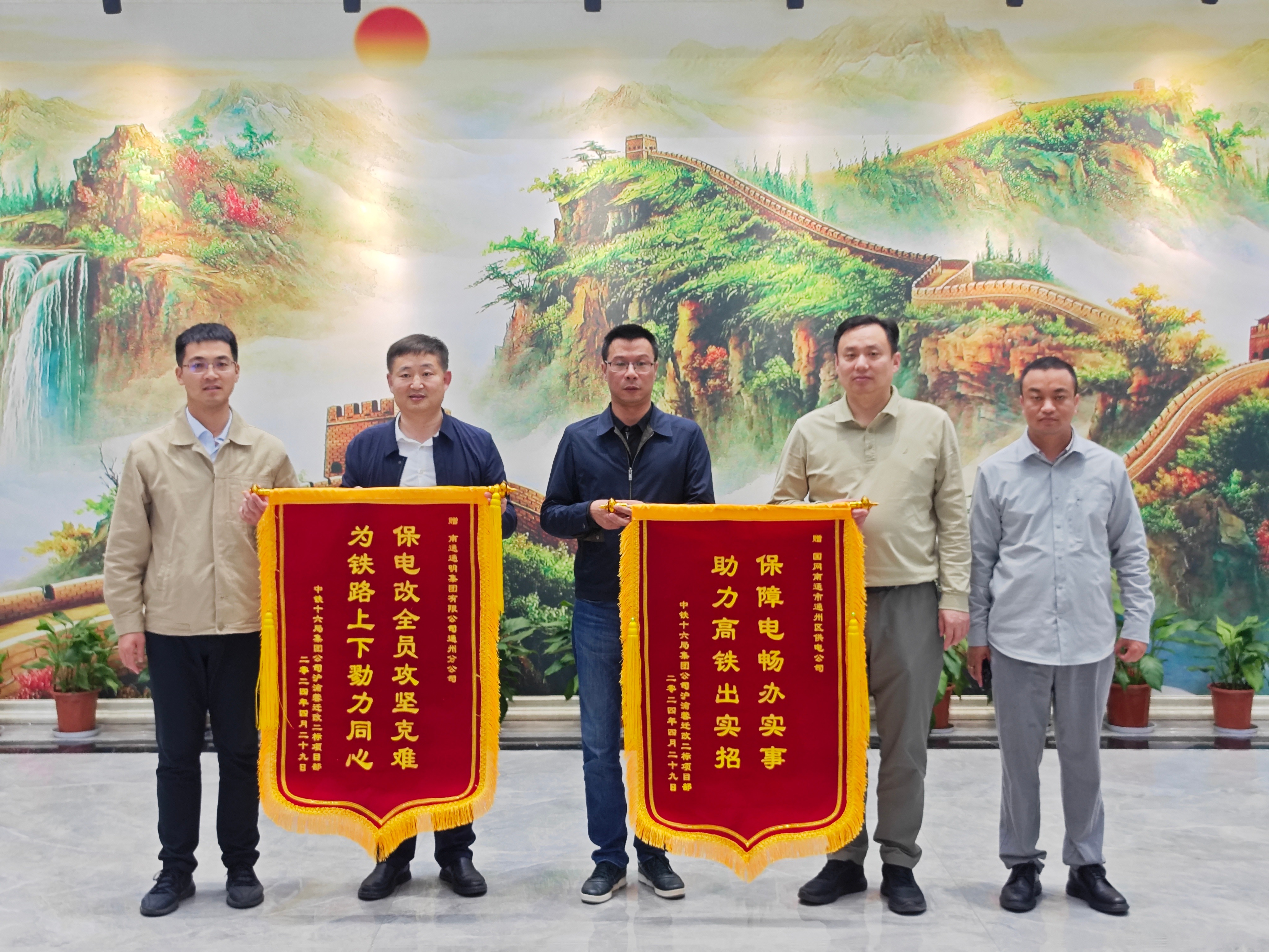 中铁十六局集团公司沪瑜蓉迁改二标段项目部相关负责人将锦旗送到国网南通市通州区供电公司总经理李云鹏、副总经理徐冰、张迈的手中。朱笑天摄