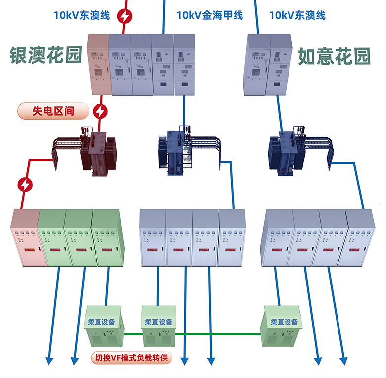 在高效建设方面,每台柔直设备占地面积为普通箱变的1/3,无需重新敷设低压管廊,台区负荷就地均衡、动态增容方式能快速解决老旧小区布点选址困难问题。在负荷互济方面,在银澳花园和如意花园部署3台柔直设备,建立起低压直流微网,台区之间具备250千伏安的交流容量互济能力。柔直设备按负载率自动分析、合理分配台区功率,将相邻台区剩余容量平稳转供,实现台区间的负荷动态均衡,保障供电质量平稳、健康。在快速复电方面,当配变低压母线以上位置计划检修或故障停电时,柔直设备将迅速启动失电支援,将失电台区负载通过直流母线紧急转供至互联台区,转供响应时间控制在100毫秒以内,真正实现失电台区接带用户的“零感知”复电。