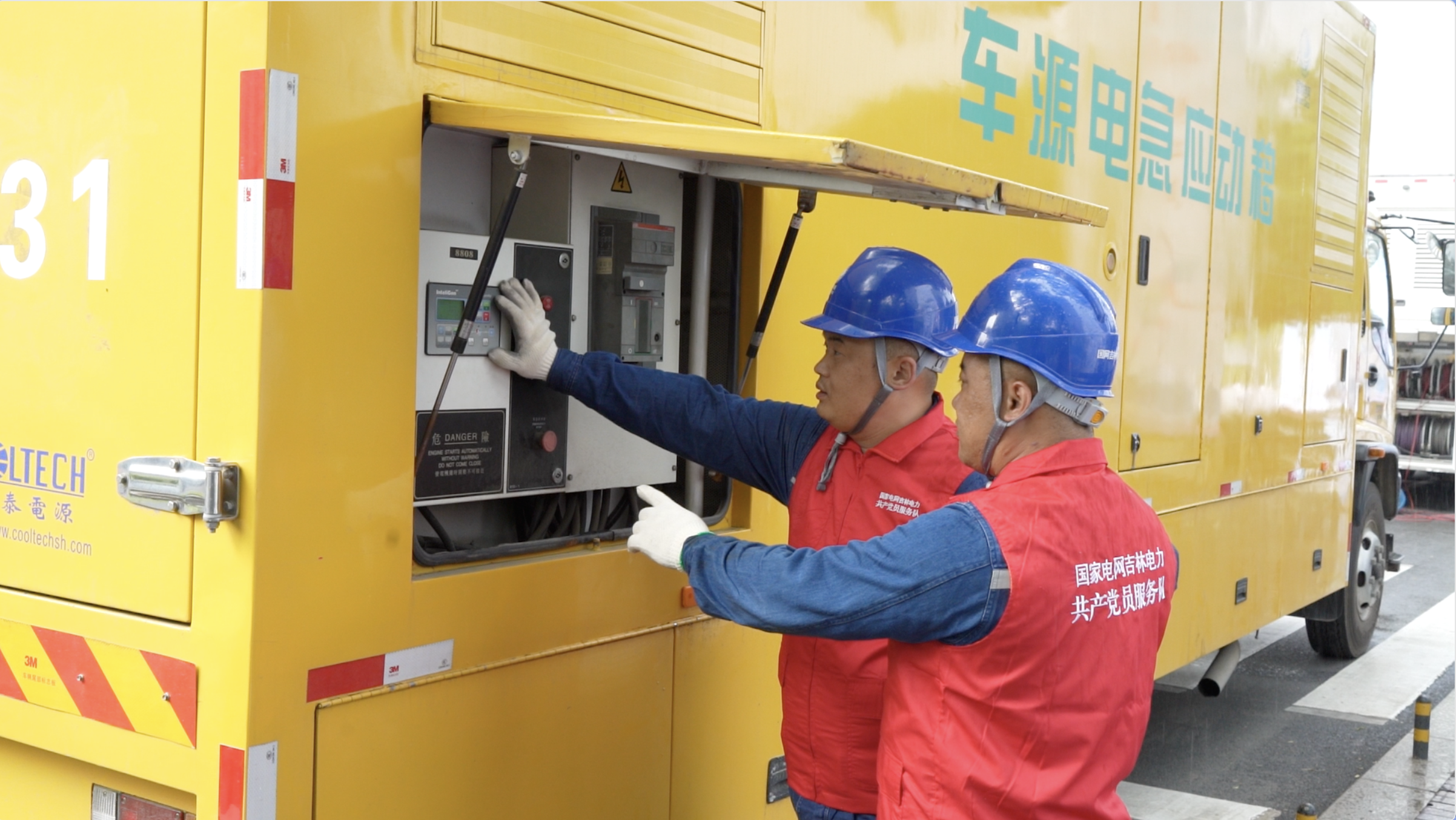5月25日,国网吉林供电公司带电作业中心员工王志学和曹伟在第十九届中国经济论坛会场外,调试、检查应急发电车,确保论坛用电可靠。沈泽洲 摄