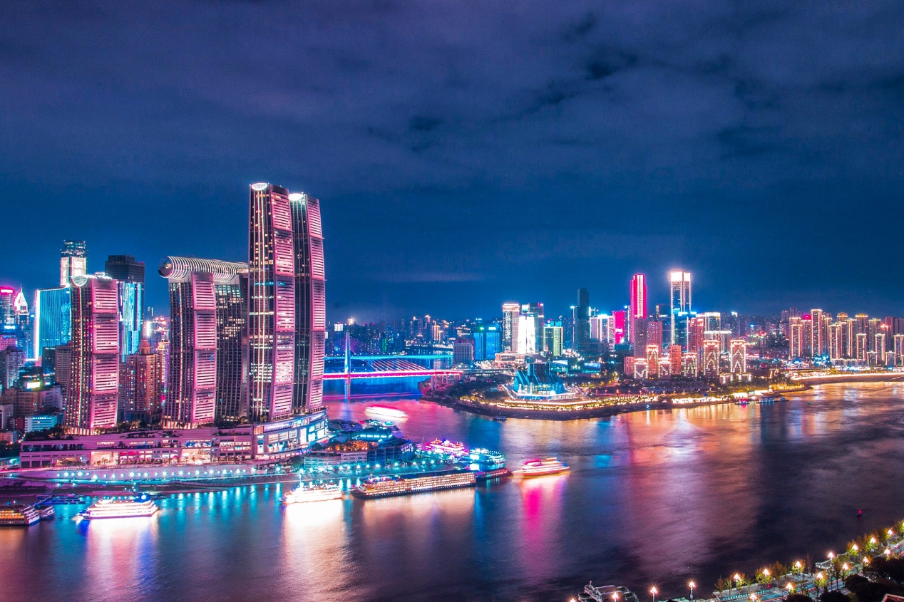 一江碧水天上来,奔流至重庆,在朝天门码头与嘉陵江交汇。重庆是山城,也是江城。两江四岸,斜阳掩映、波光点石、字水宵灯。逐渐入夜的重庆,与满天星盏相映成趣。
