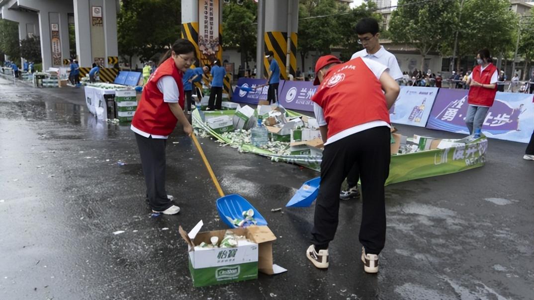 志愿者马拉松赛后清扫道路垃圾。张弘雅摄
