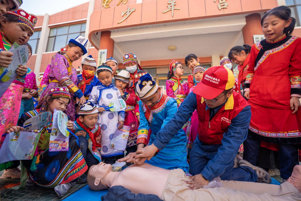 “如心脏按压的方法,两手交叉至于患者的胸前,上臂伸直,身体前倾,以胸廓下陷5cm左右,按压的次数为每分钟60-100次。掌握心肺复苏法的急救要领是……”5月20日是世界计量日,“黄河之滨”志愿者化身“电老师”来到张掖市明花电力希望小学开展了“电力安全知识进校园”活动,帮助小学生启蒙计量知识,建立安全用电意识和急救知识。课堂通过动画故事、PPT演示和模拟演练等形式吸引着学生、而这一堂课的背后是志愿者们花费了一周时间精心准备的。