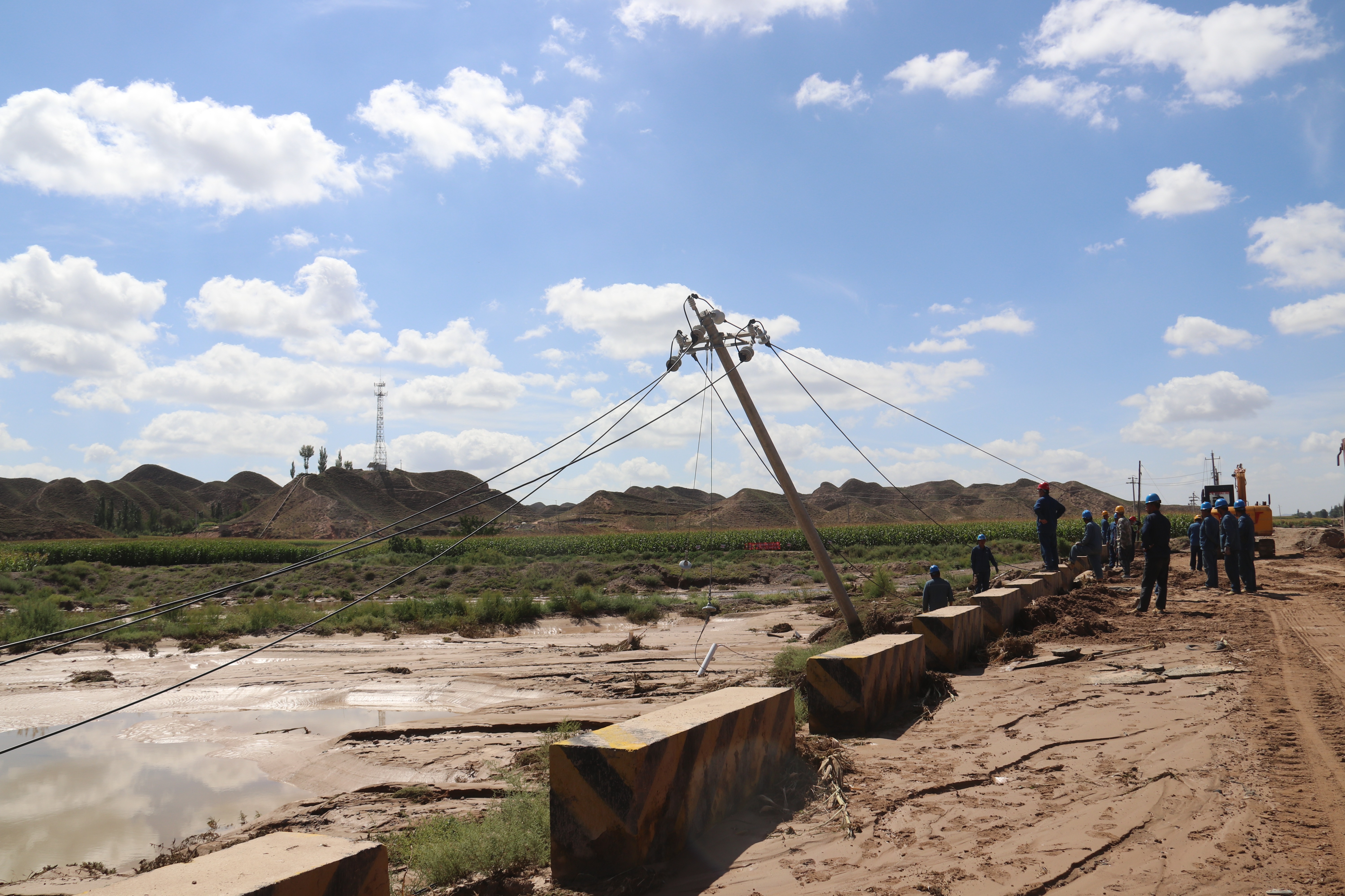 通过对线路巡视勘察,发现8条配网线路152基杆塔因洪水冲刷受损,存在电杆倾斜安全隐患。为保障受灾地区人民安全、可靠用电,公司立即组织对受损线路实施停电抢修,共计出动抢修队伍14支、抢修车辆57辆、抢修人员162人,按照“水退、路通、人进、电复”原则有序开展抢修作业。
