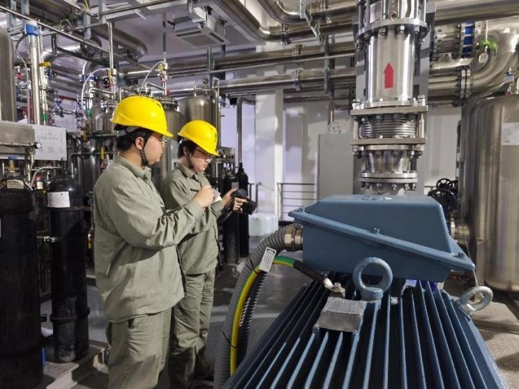 施州换流站运维人员正在对阀冷系统设备进行巡视测温。