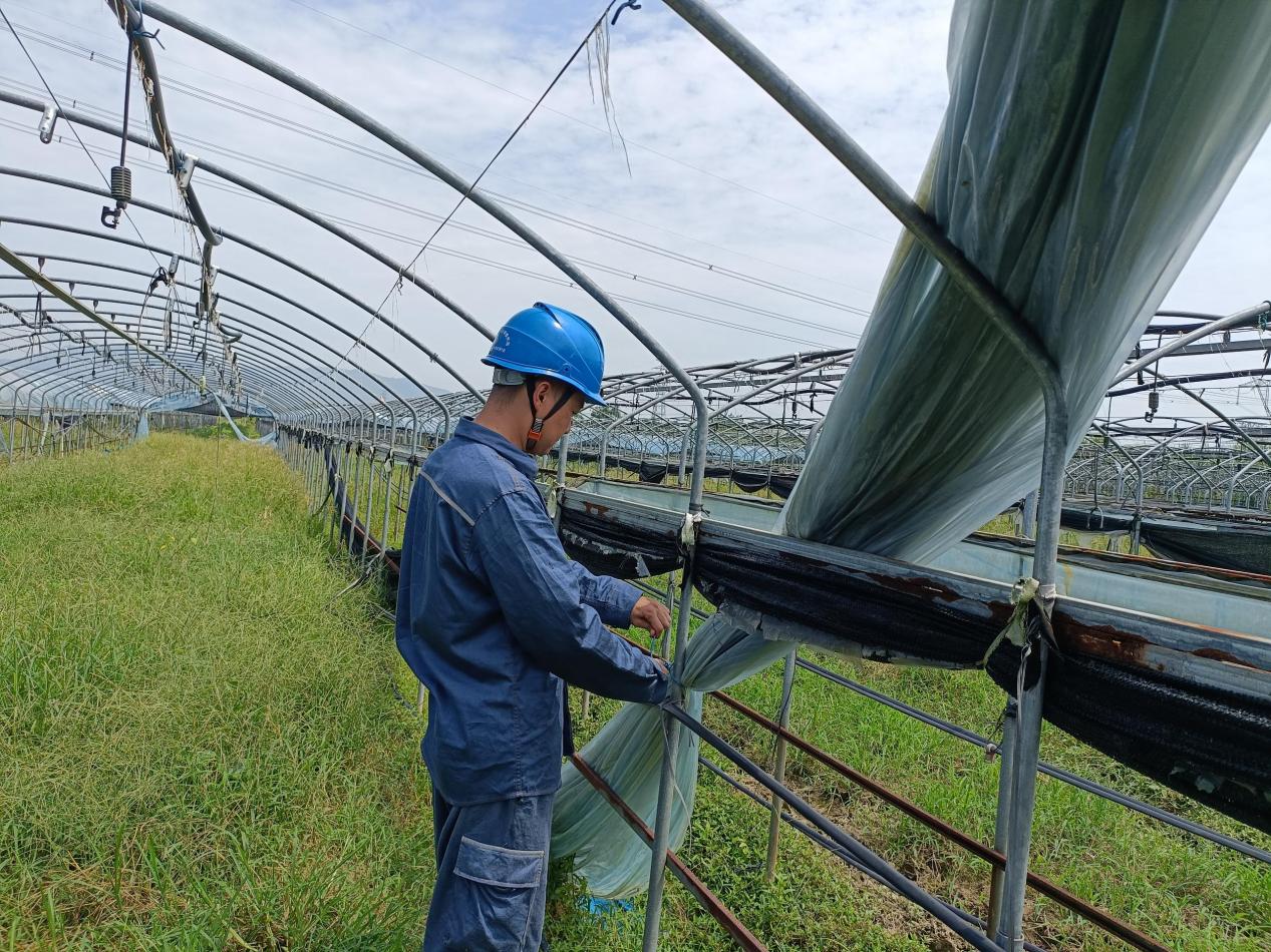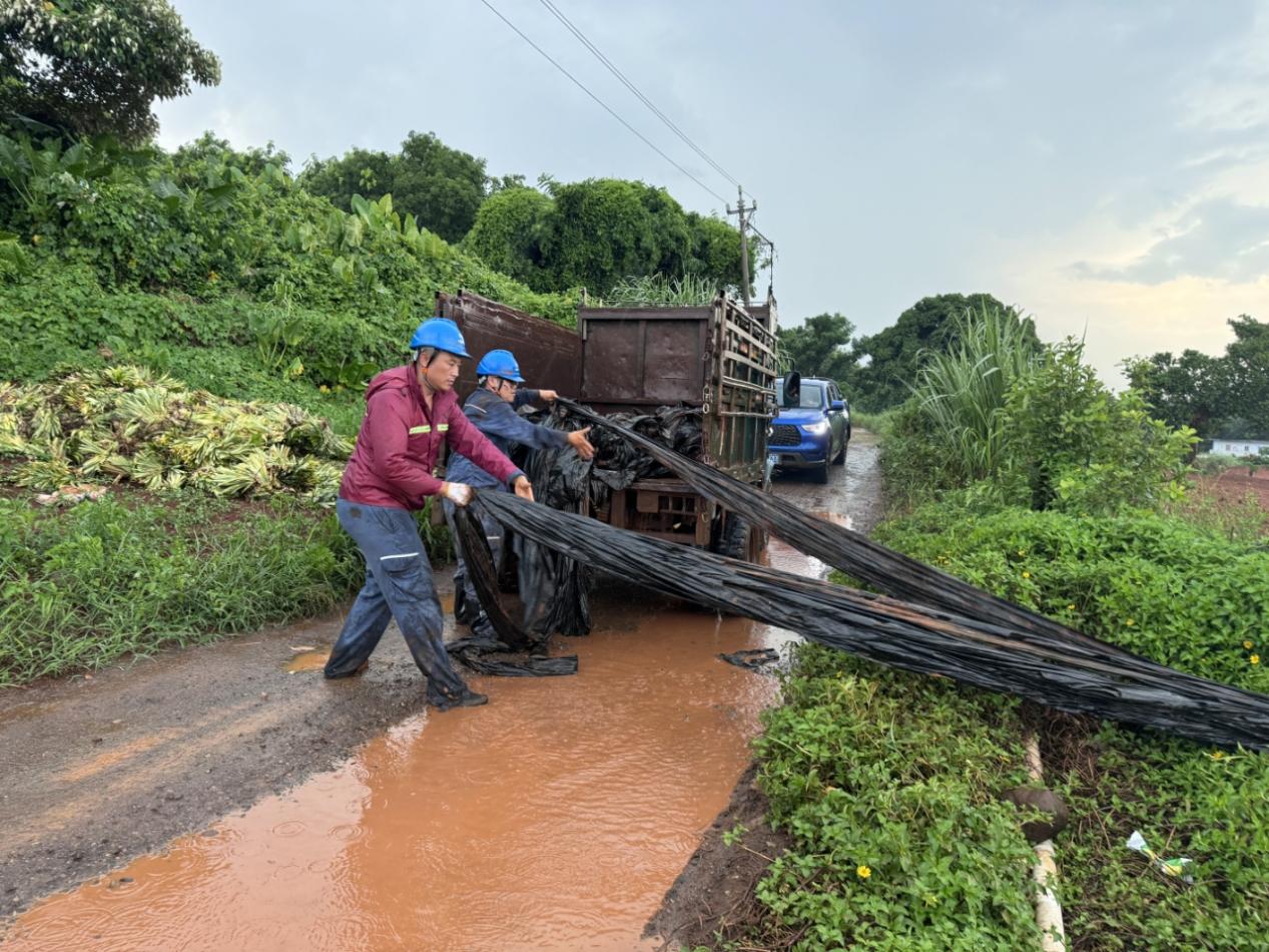 9月5日,南网超高压公司海口分局员工与村民一起冒雨清理一处塑料地膜,彻底消除此处飘挂物隐患。朱阳 摄