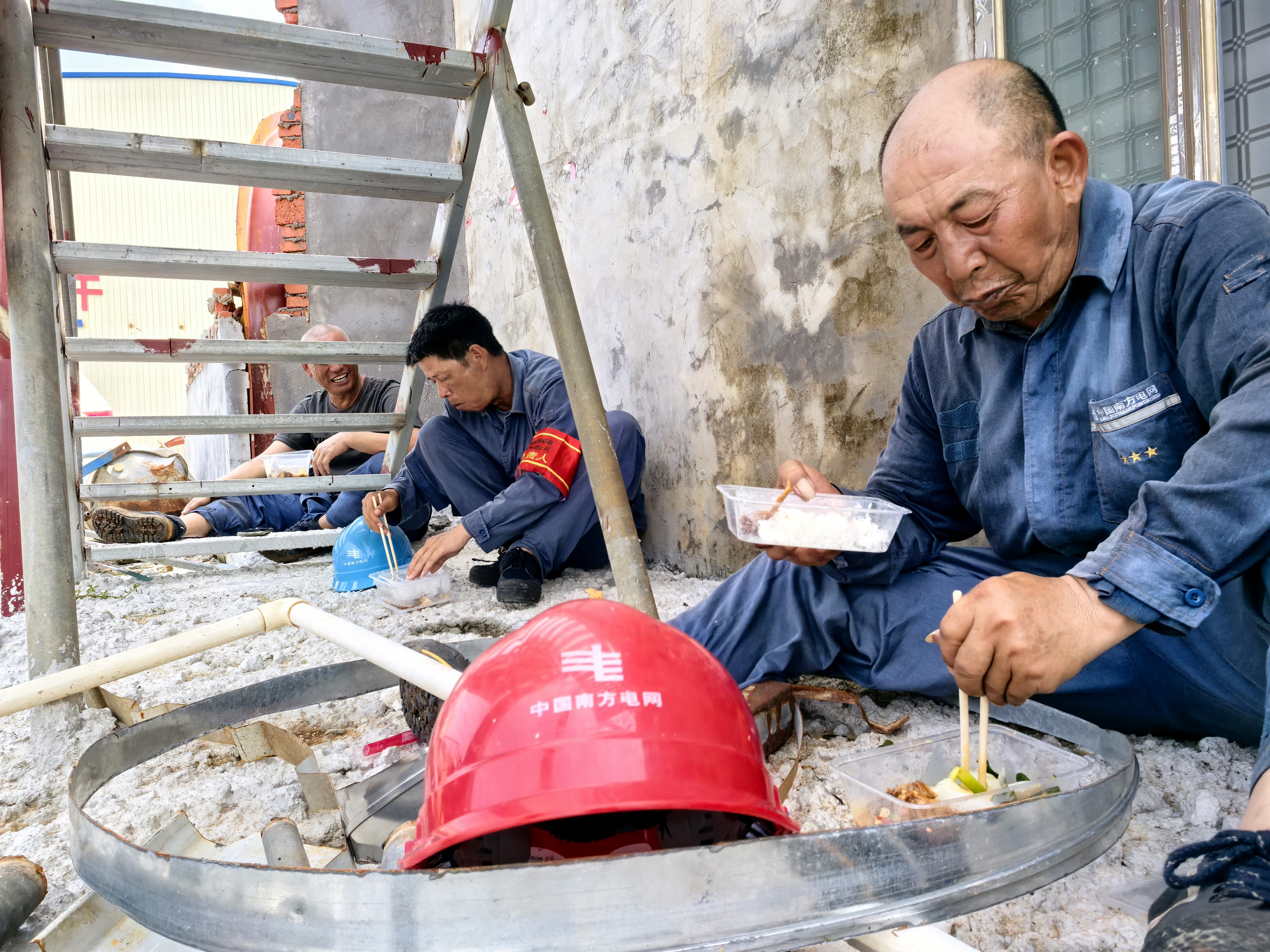 9月8日,在湛江雷州,广东电网能源发展公司的抢修人员在现场简单席地就餐,为抢修复电争取更多时间。(陈海东 摄)