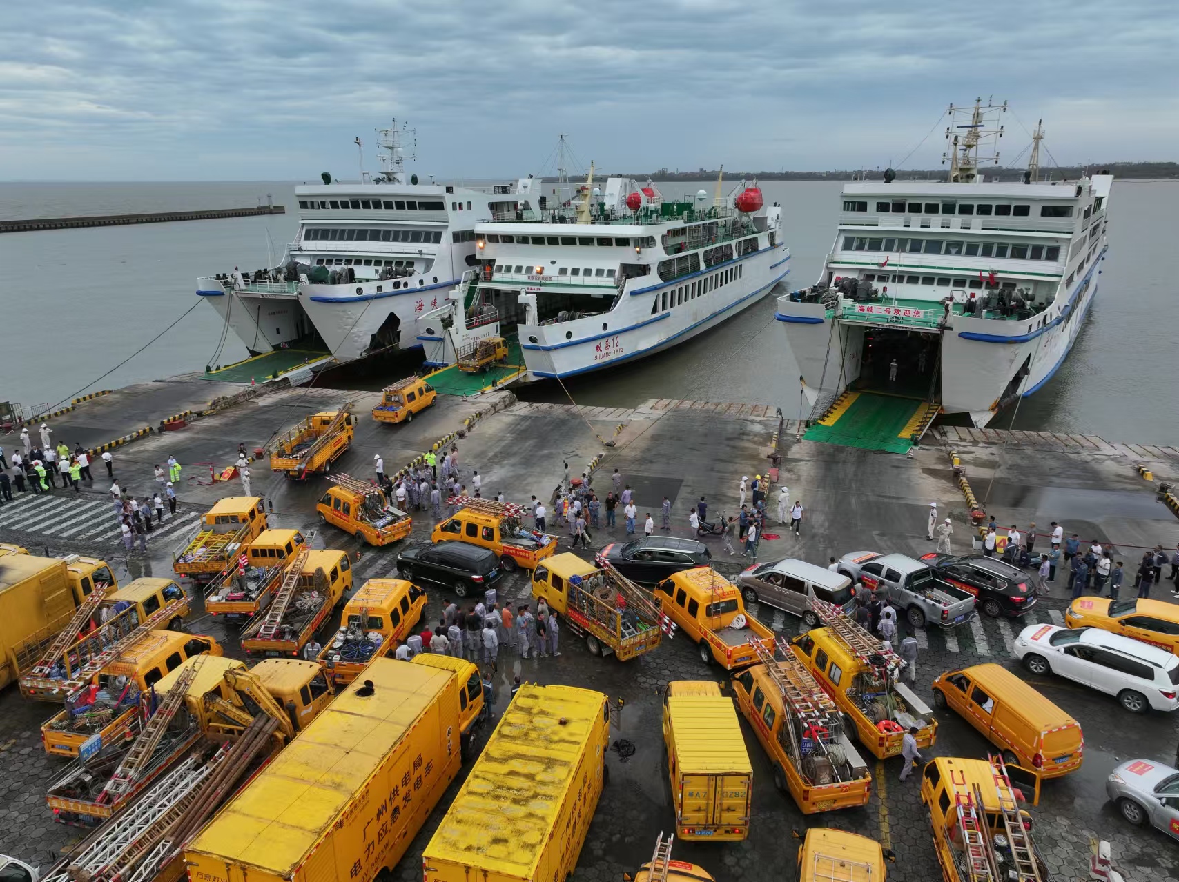 9月7日,台风“摩羯”登陆后,南方电网首批支援队伍在徐闻海安新港乘渡轮过海,全力支援海南抢修复电。(吴美芬 李志杰 摄)
