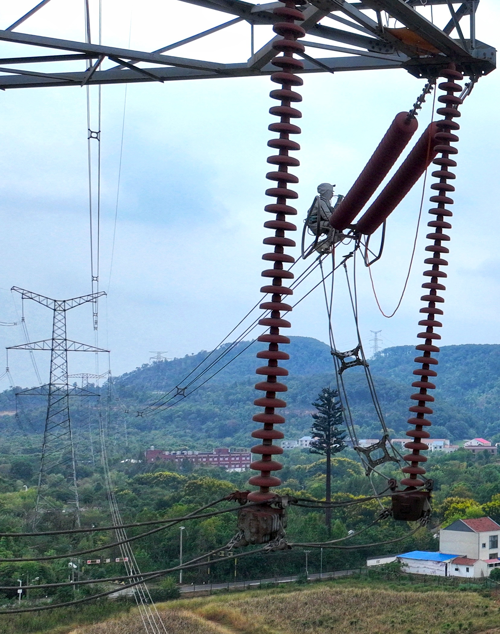 9月14日,国网湖北超高压公司带电作业人员,在耐张瓷瓶串等候下导线指令,处理500千伏汉军线线夹发热严重缺陷。黎金勇摄