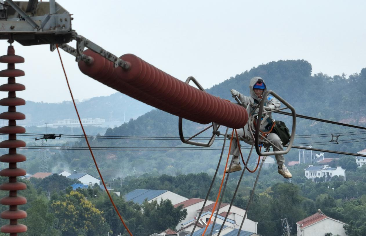 9月14日,国网湖北超高压公司带电作业人员从耐张瓷瓶串准备下到导线,处理500千伏汉军线线夹发热严重缺陷。黎金勇摄