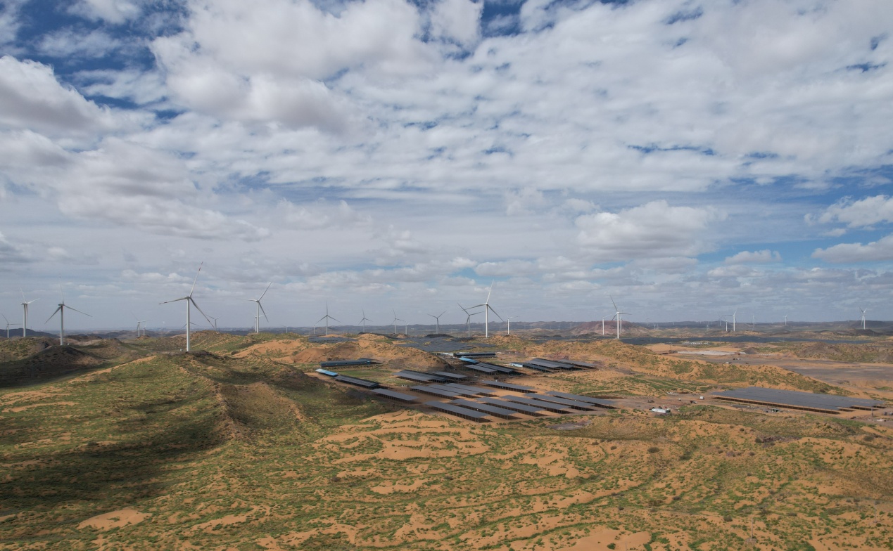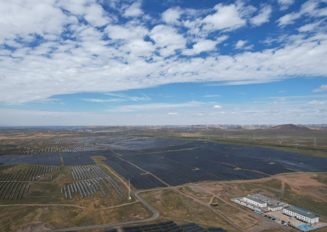 2024年9月13日,俯瞰位于宁夏中卫市中宁县境内的一处戈壁滩清洁能源发电站,风机和光伏交相辉映,源源不断输送绿色能源。