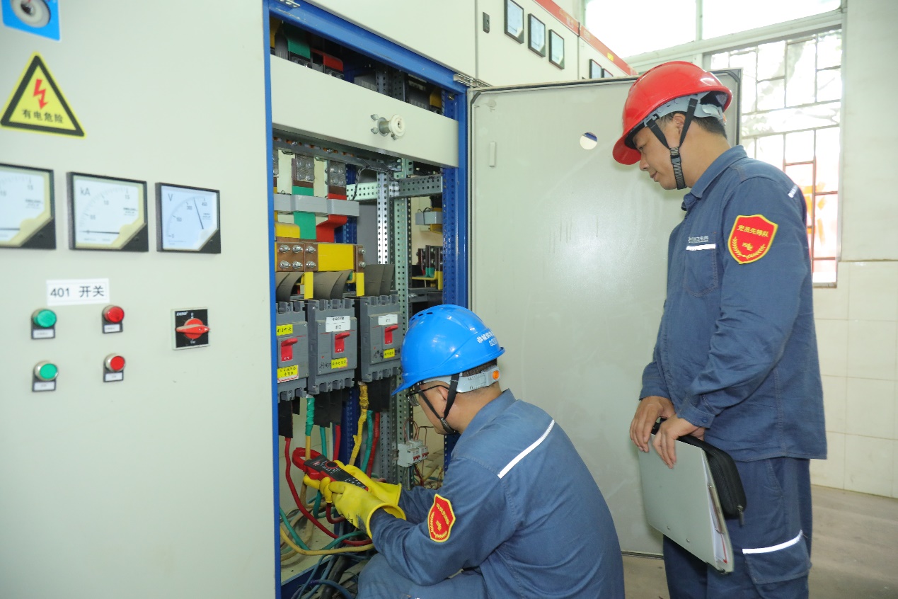 恭城供电公司保供电工作人员正在对电力设备进行安全检查。