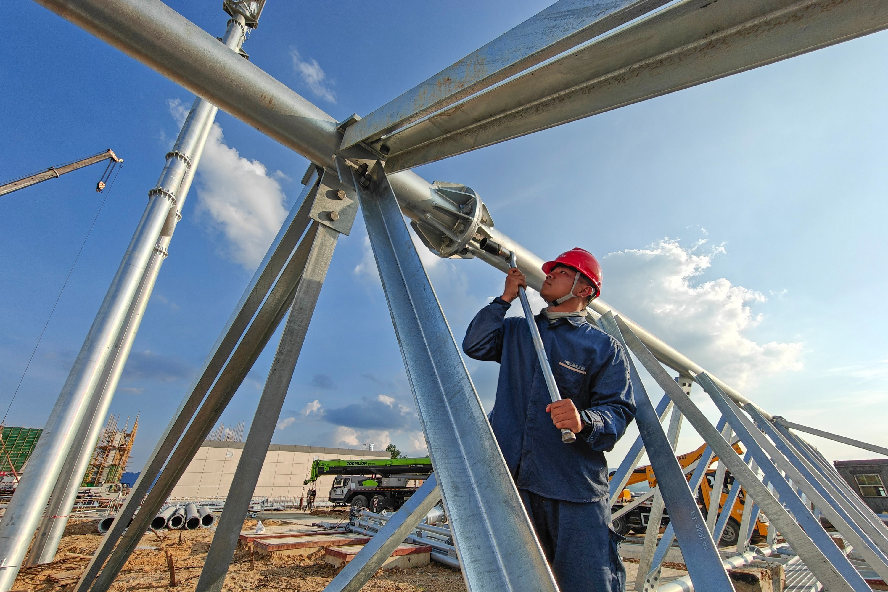 广西送变电建设公司工作人员在500千伏漓江站检查钢横梁质量。梁磊 摄