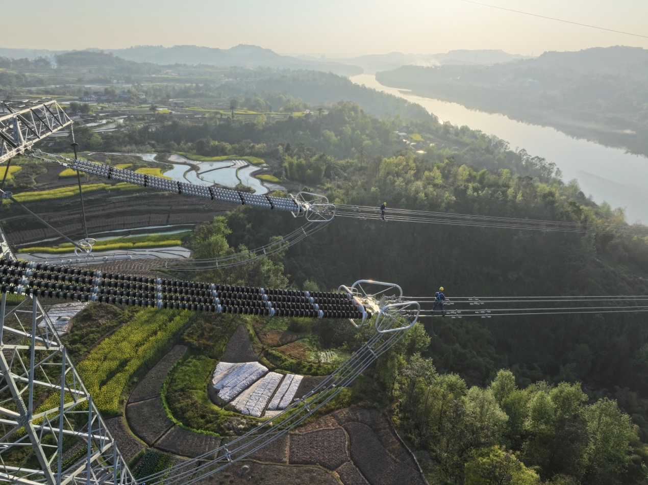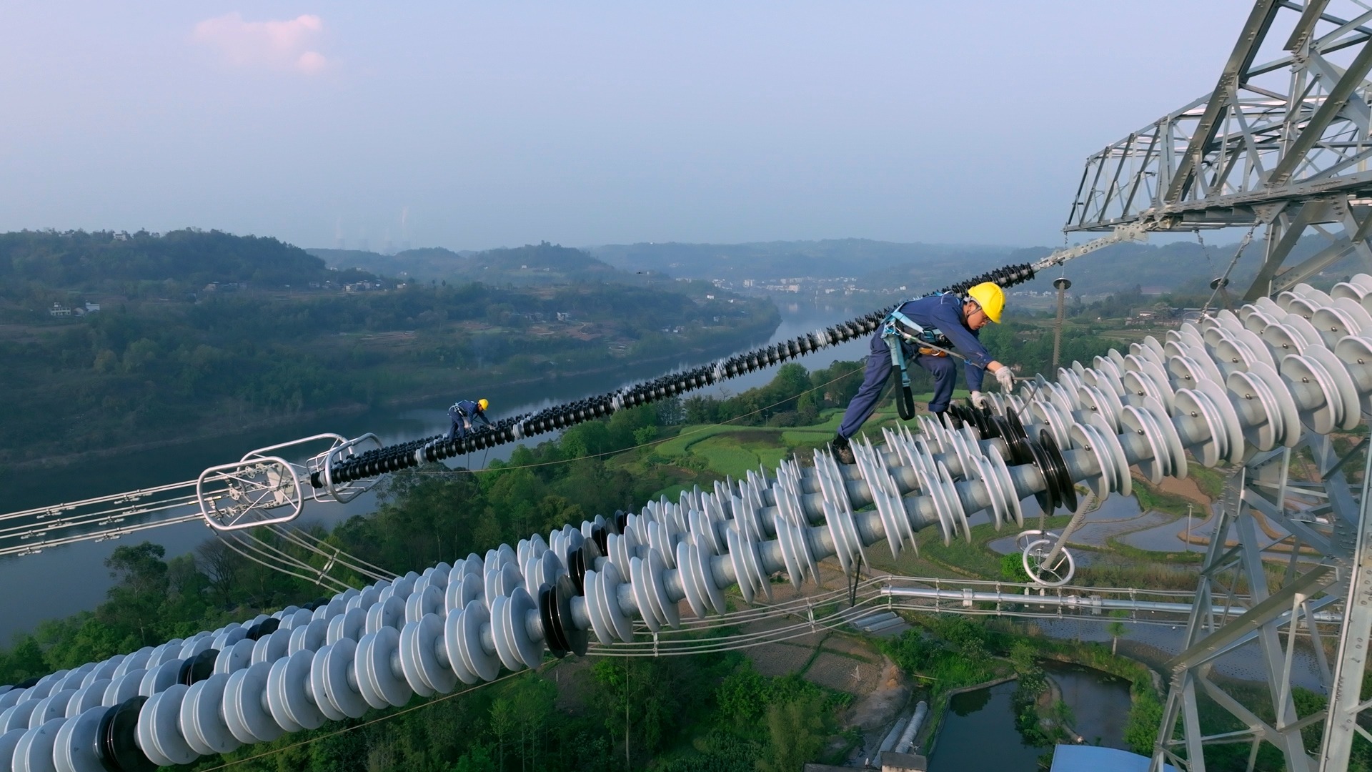 国网重庆超高压公司输电运检员工正对哈密—重庆±800千伏特高压直流输电工程重庆段开展走线验收。林熙熙 摄