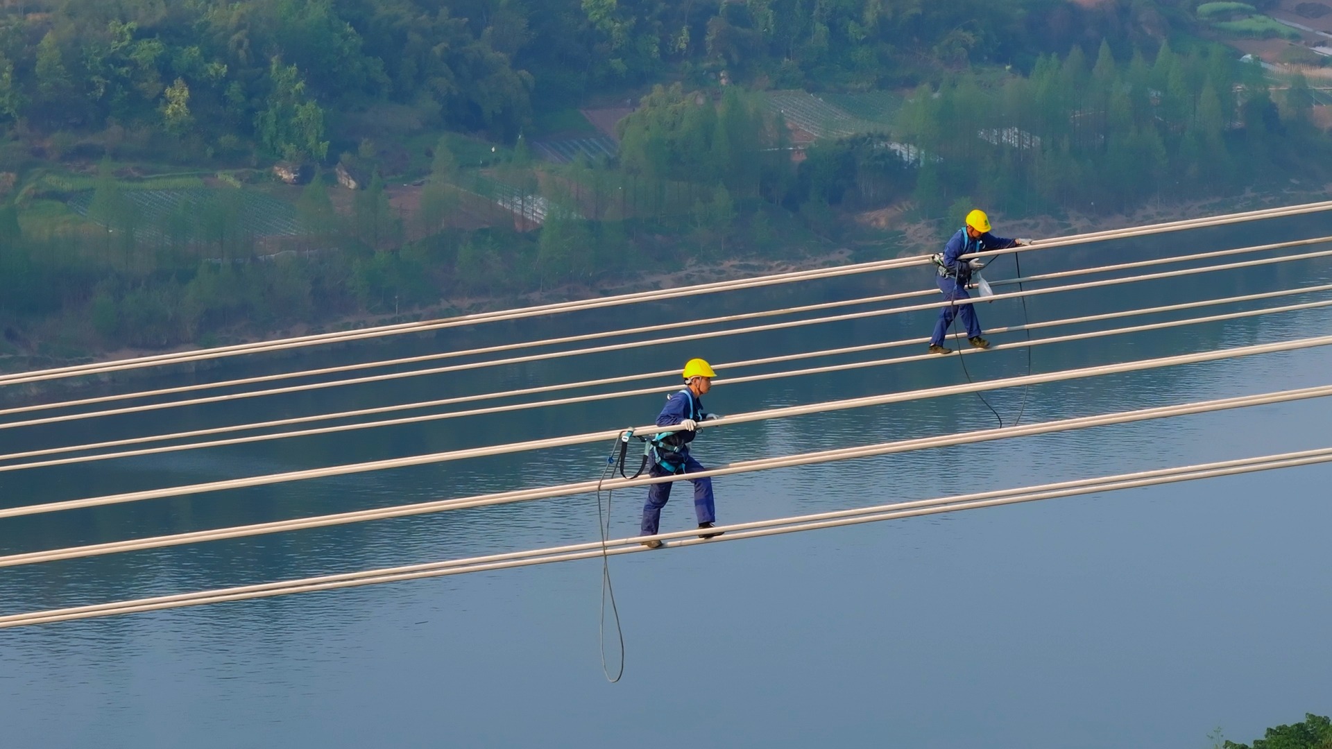 国网重庆超高压公司输电运检员工正在渠江上开展导线检查。李涛 摄