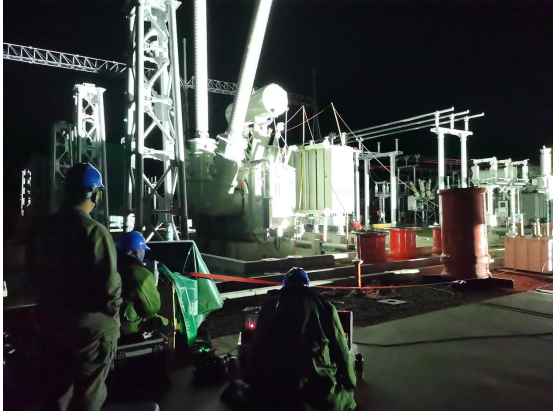 卡麦换流站首台500千伏站用变长时感应耐压带局部放电测量试验现场。