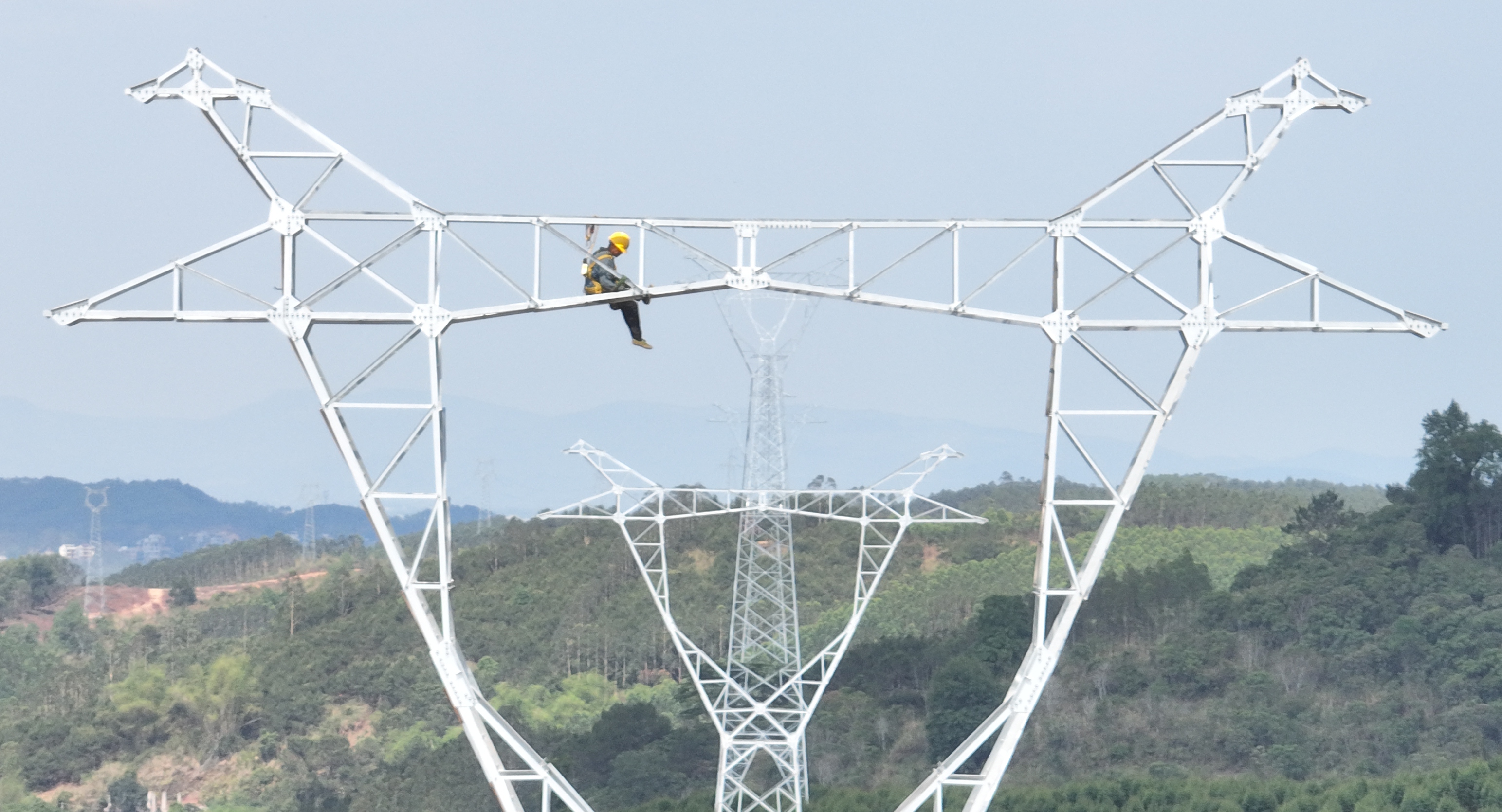 5月2日,在南宁市武鸣区至三塘镇的崇山峻岭间,崭新的铁塔高耸,电网“高空飞人”头顶烈日,穿梭于银线之间,在四五十米高空,开展线路附件安装作业。当前,南宁抽水蓄能电站500千伏送出工程进入冲刺攻坚期,电网建设者们全力以赴,冲刺工程5月底建成投产的目标。