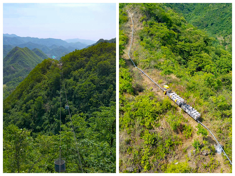 “山路不通,那就架起索道当‘天梯’,物资运输照样畅行无阻!”业主项目经理管飞介绍,工地位于秦岭余脉,山势层峦叠嶂,面对车辆、骡马均无法通行的险峻地形,工程建设方创造性搭建空中运输通道,每日可运输50吨建设物资。