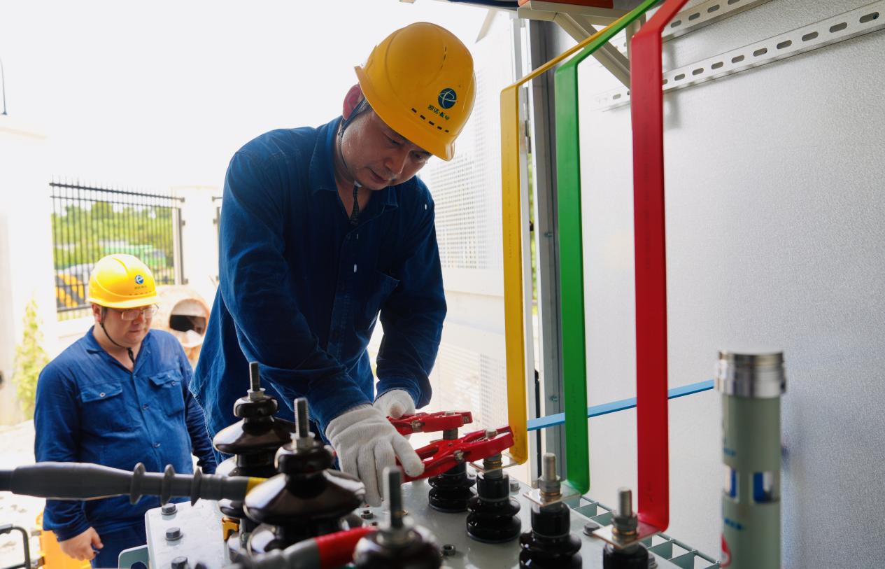 “针对1天的极限工期,我们挑选精锐施工力量,以高效协同的作战模式,圆满完成了2台250千伏安箱式配电箱吊装、电缆敷设、试验调试及搭接等关键环节。同时,在现场配备防暑降温药品和充足的饮用水,确保施工人员保持良好的工作状态。”现场工作负责人汪晓俊说道,我们时刻关注高温天气下每一名施工人员的工作状态,保证高温下的作业安全。