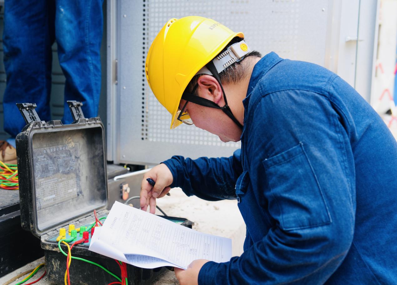 正午时分,施工现场在阳光炙烤下表面温度直逼50摄氏度,热浪裹挟着金属设备的灼烫气息扑面而来,配电、电缆、试验等专业人员有条不紊地展开作业,一组人员对箱式变压器核心设备进行电气测试与机械检查;另一组人员正抓紧进行电缆敷设和搭接工作,确保每一个环节、每一个操作都精准到位。